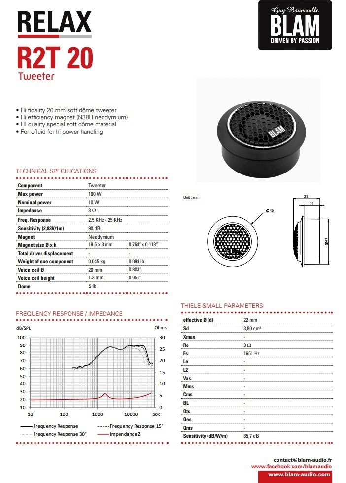 BLAM R2T20 высококачественные твитеры с шелковым куполом 20 мм для точного воспроизведения высоких частот. Модель отличается впечатляющей мощностью до 100 Вт и чувствительностью 90 дБ, что обеспечивает кристально чистое звучание в диапазоне от 2500 до 25000 Гц. Компактные размеры (монтажная глубина всего 14 мм, монтажный диаметр 41 мм) и сопротивление 3 Ом делают установку простой и совместимой с большинством аудиосистем. Неодимовый магнит гарантирует надёжность и долговечность работы.